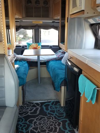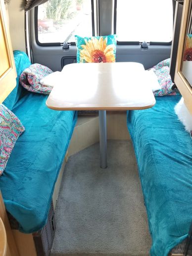 The back area can be a diing area with the table and U-shaped bench seats. Table top can be set down , turning into queen-sized bed, or table top can be removed for 2 twin-sized beds.