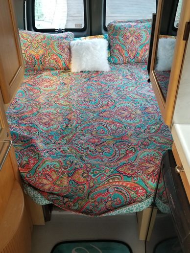 Queen-sized RV bed is approximately 71 inches wide, 74 inches long (on the left) and 80 inches long (on the right).