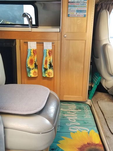 As you step inside from the third seat, you will see the closet for storage and the kitchen (stove, sink, refrigerator, and storage with pans & dishes).