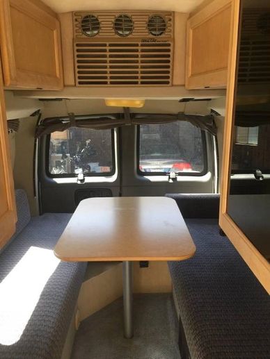 View of the back of the van, set up as a dining room table with bench seats. Air conditioner above middle, between two overhead storage cabinets. Notice the windows in the back doors.